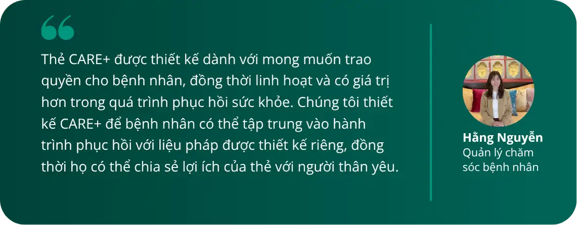 Với nhận thức ngày càng tăng của người dân Việt Nam về chăm sóc phòng ngừa không xâm lấn, Thẻ CARE+ đáp ứng nhu cầu ngày càng tăng về các lựa chọn điều trị dễ tiếp cận và được cá nhân hóa để giảm đau, phục hồi khả năng vận động và sức khỏe chức năng tổng thể. CARE+ giúp việc quản lý sức khỏe theo cách của bạn trở nên dễ dàng hơn bao giờ hết - không bị giới hạn bởi các gói dịch vụ truyền thống hay lịch trình cứng nhắc.