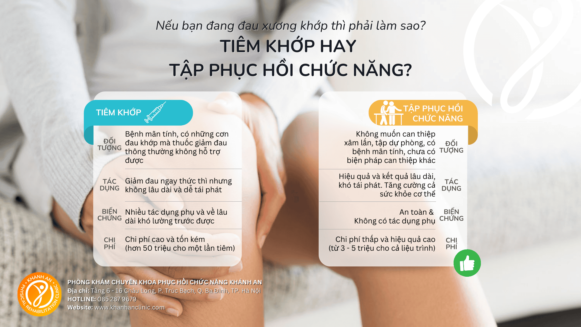 Một phương pháp An toàn và Hiệu quả hơn đó là TẬP PHỤC HỒI CHỨC NĂNG. Giúp bệnh nhân giảm đau và đem lại kết quả lâu dài. Thông qua sử dụng các thiết bị vật lý trị liệu tiên tiến và thực hiện các bài tập vận động để cải thiện chức năng và sức khỏe của hệ cơ xương khớp. Phòng Khám Khánh An tự hào trong việc phát triển các chương trình vật lý trị liệu và phục hồi chức năng dựa trên tiêu chuẩn của Quốc tế và của Mỹ. Đặc biệt là các chương trình không sử dụng thuốc, không can thiệp phẫu thuật, nhằm đảm bảo an toàn và giảm thiểu biến chứng và nguy cơ từ các vấn đề liên quan đến xương khớp.